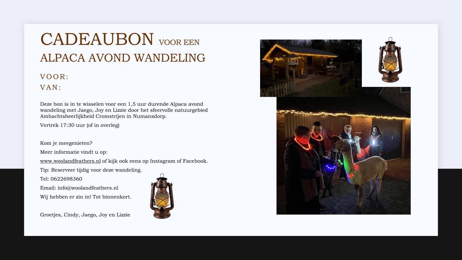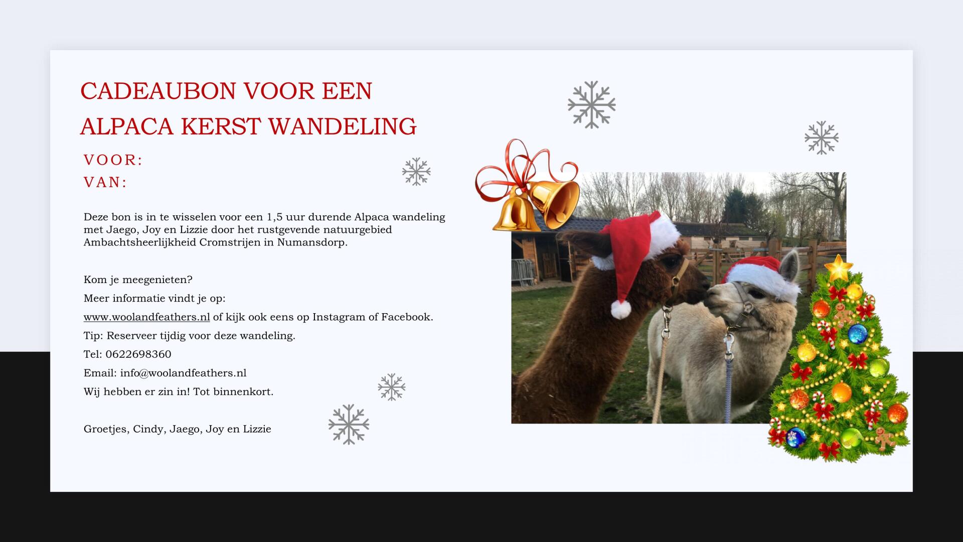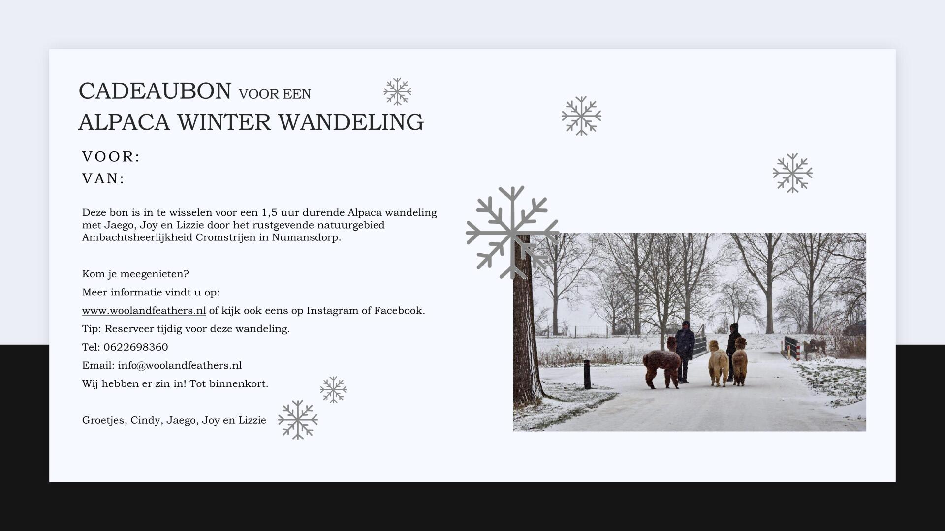 The days are getting shorter and the temperatures are dropping. We don't have such a thick woolly coat as the Alpacas, that's why we offer to enjoy a free hot chocolate and some treats during the Christmas holidays (Saturday December 18, 2021 to Sunday January 9, 2022) halfway through the walks! !! Please indicate this when booking with how many people you want to participate in this promotion.
