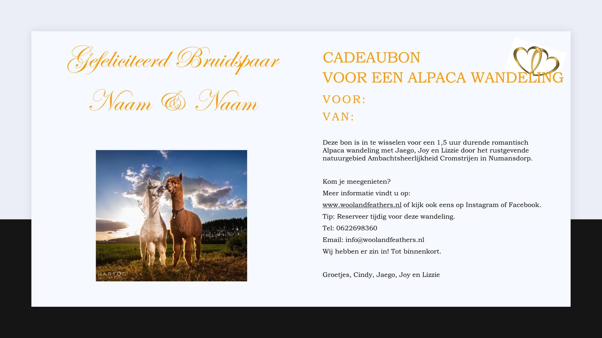 For a birthday, children's party or wedding, it is even possible to have one of the Alpacas offer the gift or rings around the Alpaca neck to the birthday boy or the bridal couple.